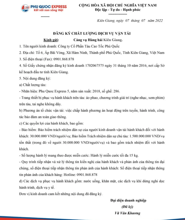 Dưới đây là đăng ký chất lượng dịch vụ của tàu Phú Quốc Express 5: