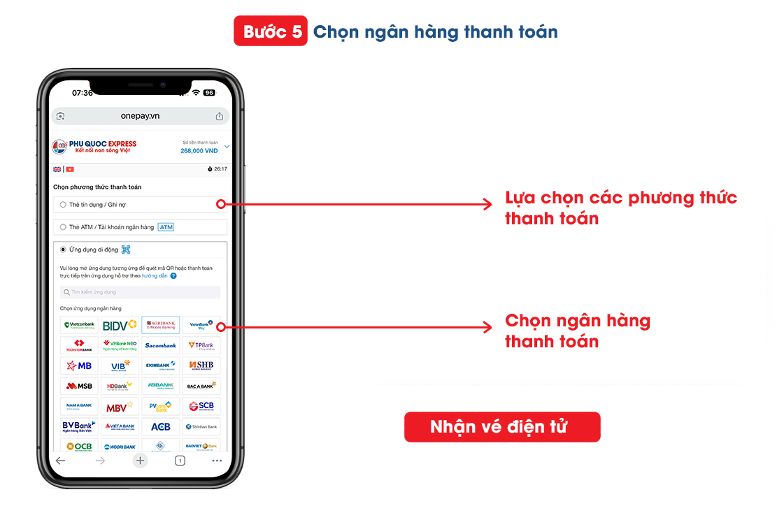 Chọn ngân hàng thanh toán vé tàu và sau khi giao dịch thành công, vé điện tử sẽ được gửi qua email mà bạn đã đăng ký khi điền thông tin hành khách.