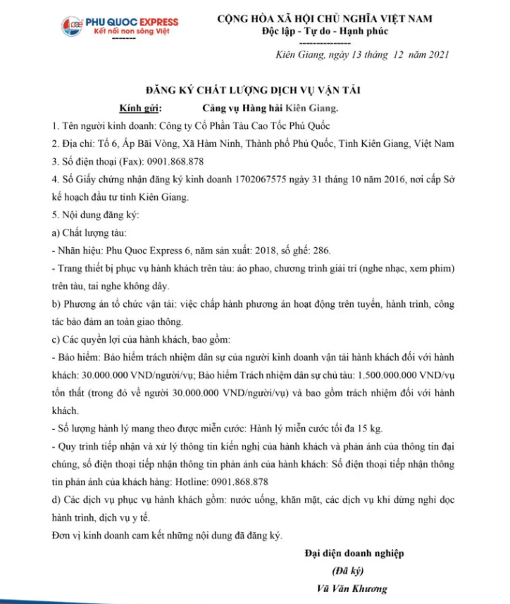 Dưới đây là đăng ký chất lượng dịch vụ của tàu Phú Quốc Express 6: