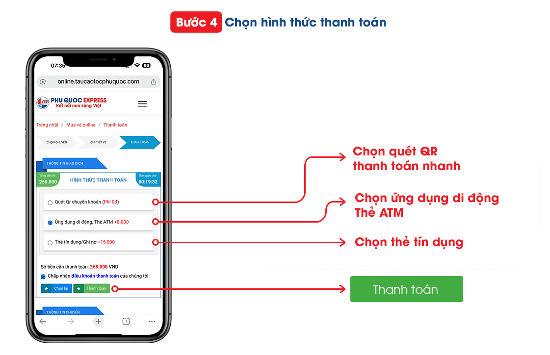 Thanh toán vé tàu Phú Quốc Express 8 Hà tiên - Phú Quốc (ví điện tử, mã QR, ứng dụng di động…). Sau đó xác nhận biên lai thanh toán và kiểm tra email để nhận vé điện tử.