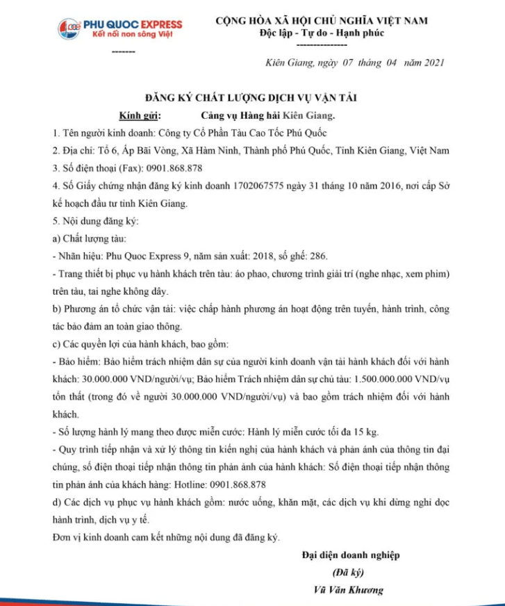 Dưới đây là đăng ký chất lượng dịch vụ của tàu Phú Quốc Express 9: