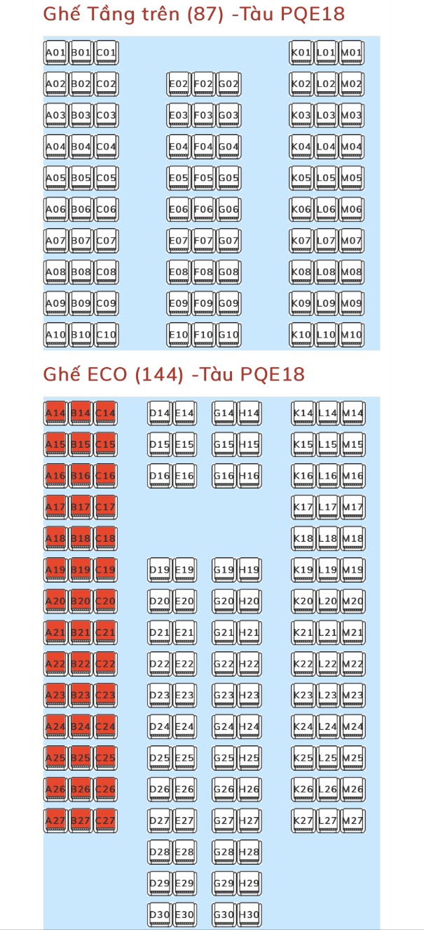Khi đặt vé tàu cao tốc Phú Quốc Express 18 (tàu Vũng Tàu đi Sài Gòn PQE 18) hành khách sẽ được chọn ghế ngồi trên tàu. Dưới đây là sơ đồ bố trí ghế ngồi: