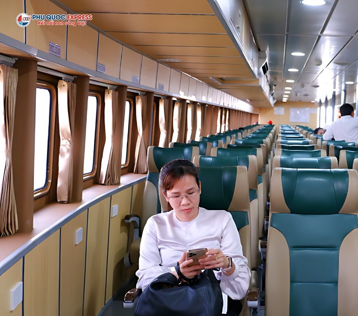 Tiện nghi hiện đại: Ghế có độ ngả 130 độ thoải mái, vách ốp da, sàn chống ồn. Boong rộng với sức chứa 50 khách ngắm cảnh đẹp và check-in. Camera hành trình, hệ thống âm thanh, tai nghe không dây và ổ sạc tại mỗi ghế. Phú Quốc Express đạt đạt chuẩn an toàn và hoạt động tốt trong điều kiện thời tiết xấu.
